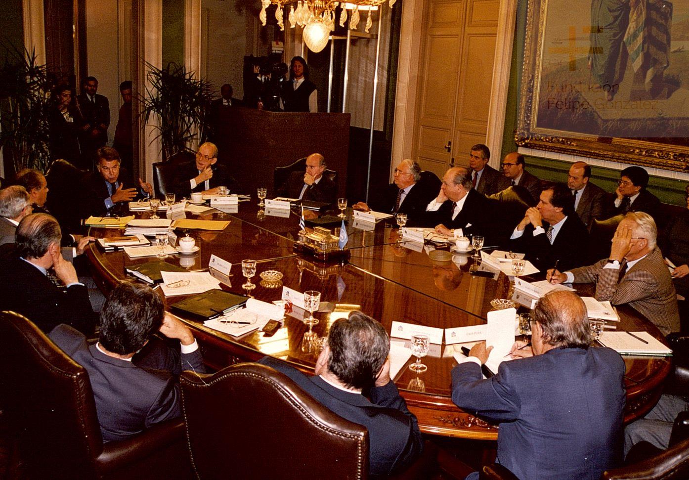 Por iniciativa del entonces Presidente del Uruguay, Julio María Sanguinetti, con la realización de una reunión que convocó a un destacado grupo de intelectuales, financistas y políticos de Europa y América Latina.